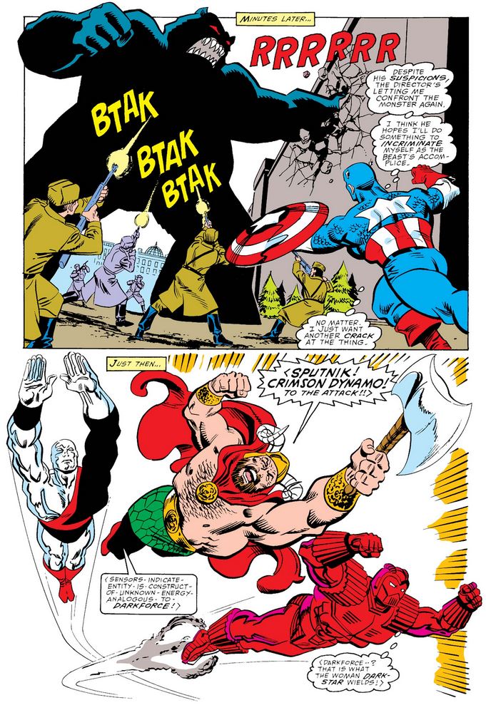 After the collected heroes fight the creature some more, the Russian three are absorbed, and Cap just dives in after them, discovering—as the Crimson Dynamo suspected, and his allies came to see as well—that the monster embodied the spirits of the Soviet Super-Soldiers, using their powers from the other side of the globe to attack the Supreme Soviets.