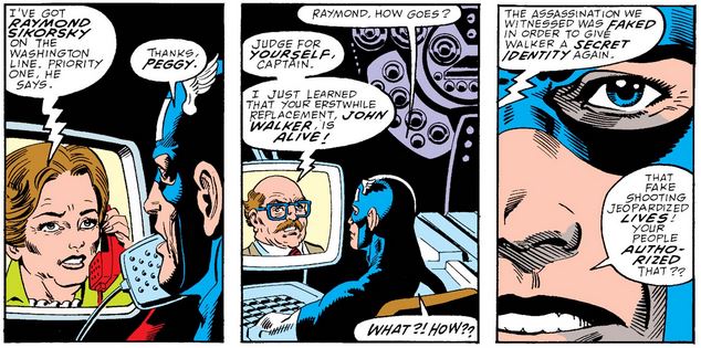 Naturally Cap is upset about the violent “assassination” (in issue #351), but I’m more confused about John Walker getting a new “secret identity” out of this. As far as I’ve seen, everyone he interacts with still calls him Walker, and he doesn’t seem to have much of a private life (much like Cap, most of the time). I imagine the point is more that the world at large isn’t aware that U.S. Agent is the same man who stood in as Captain America the last year and a half.