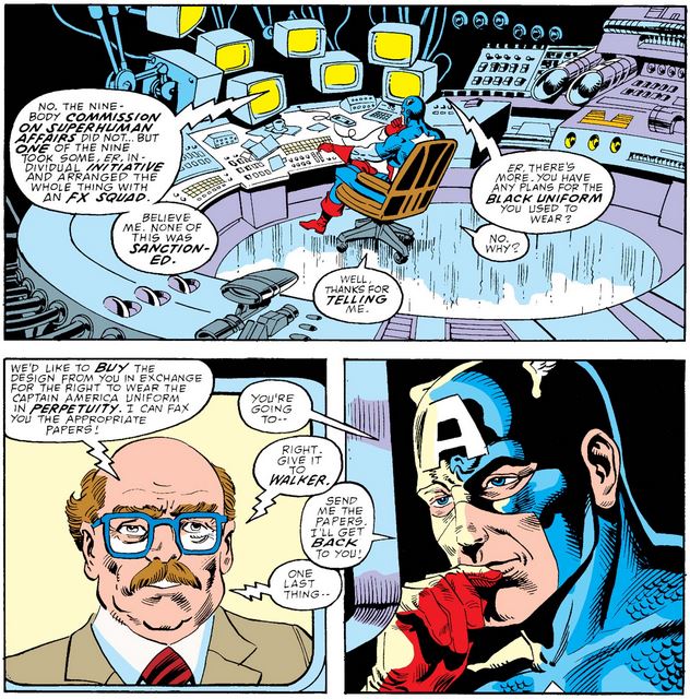 …and Cap seems surprisingly nonchalant about it. (Again, I find it odd that he has to given the right to wear the traditional outfit, which I would have thought was settled after the end of issue #350.)