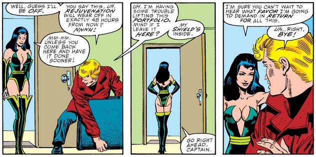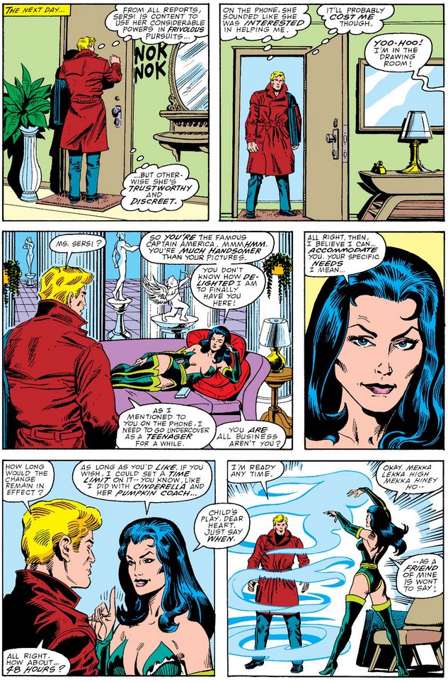 Cap seems to know what he’s in for as he visits Sersi, but he certainly didn’t expect a full-on Mae West greeting. And of course, his request is perfect rational and well thought-out. (You know, Peter Parker might have been perfect for this… just sayin’.)