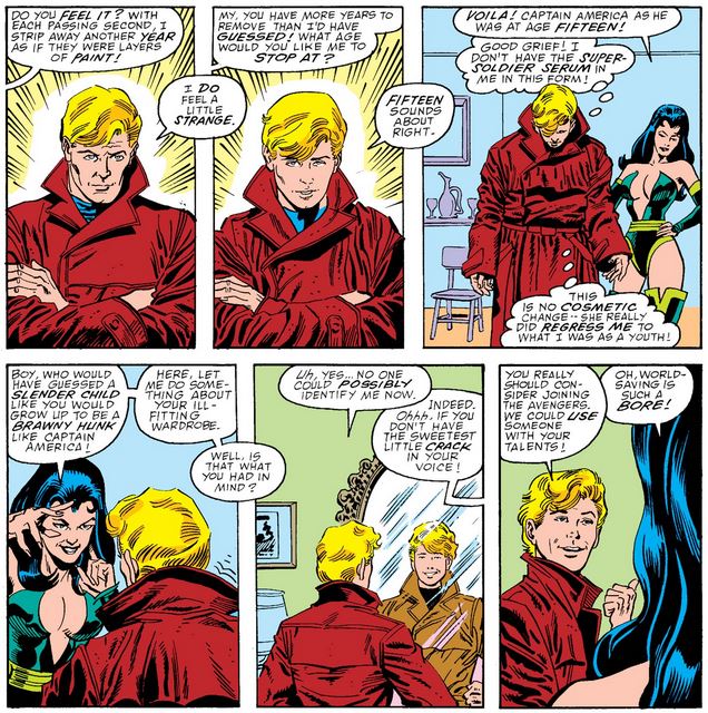 Sersi de-ages Cap to fifteen years old, negating the Project Rebirth treatment but not affecting his mind at all. (Neat trick there.)
