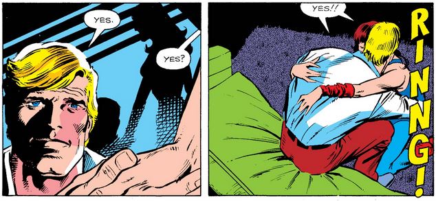 Bernie’s call sends Cap down memory lane, although—in what is becoming a theme of this issue—he denies he and Bernie were ever affirmatively engaged, asserting that he never said yes to her, although we saw at the end of issue #294 that he said yes several times and very enthusiastically, after which their engagement was referenced numerous times, especially as it ended (however ambiguously).
