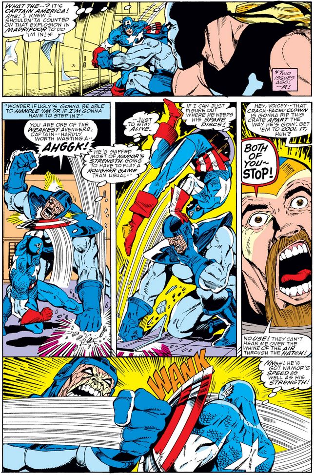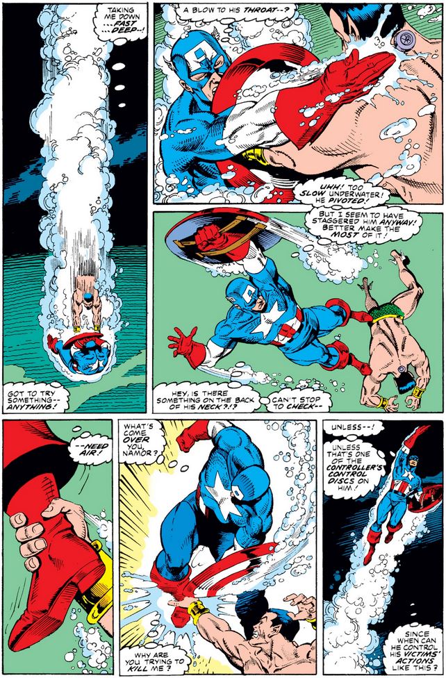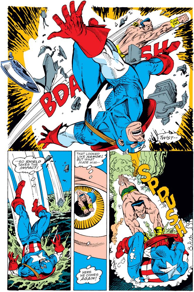 After practicing some quick defensive maneuvers above, Cap goes on the offensive below, using his new favorite move (seen in issues #361 and #364), before noticing the little device on the back of Namor’s neck.