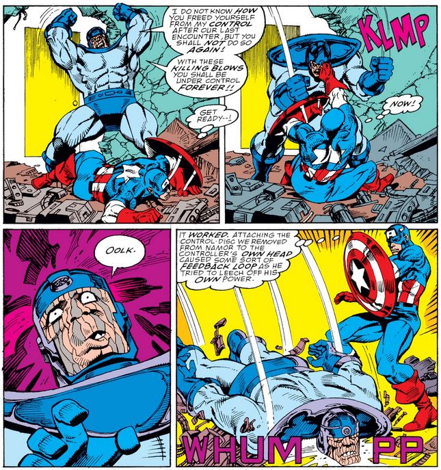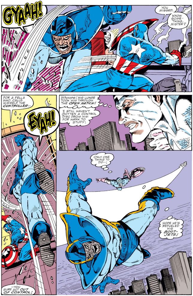 Back to Cap and the Controller, having successfully landed: The villain nails Cap with one of his devices…