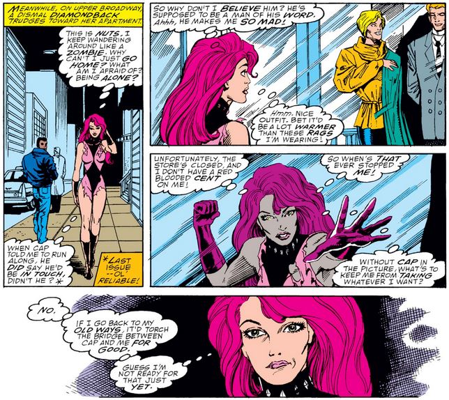 Interlude: What’s Diamondback up to while all this is going on? Resisting the temptation to commit crimes, so as to not to spoil any progress she’s made with her favorite Avenger.
