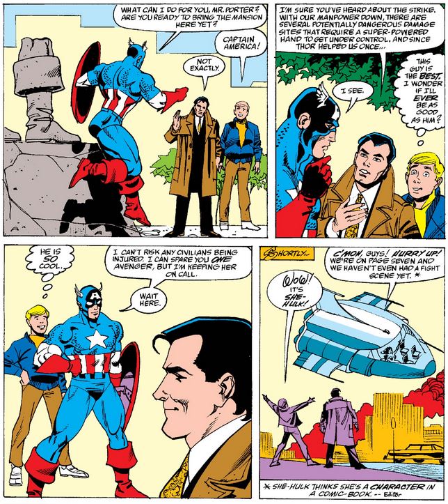 Now we shift gears a lot to Damage Control #3, where the firm’s John Porter enlists the Avengers’ help in light of a labor action, and Cap offers She-Hulk. (I’m sure Cap would not endorse “scab” labor if he weren’t so concerned about the danger to persons and property.)