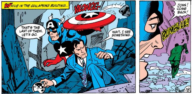 Captain America (vol. 1) #365, mid December 1989, “Submission”: Mark Gruenwald (writer), Kieron Dwyer (pencils), Danny Bulanadi (inks), Bob Sharen (colors), John Morelli (letters). (More details at Marvel Database.)