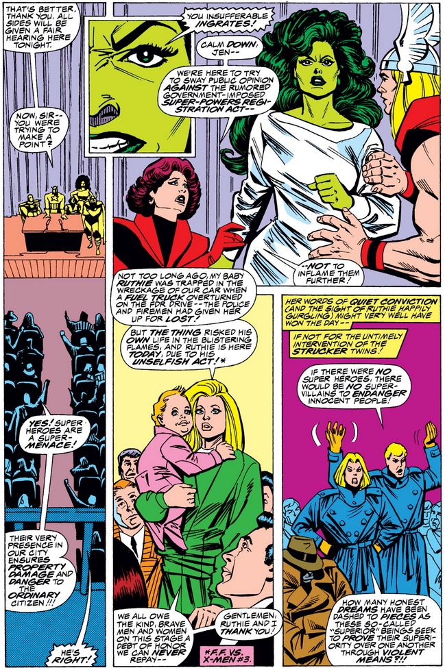 Where were the FF, anyway? Earlier this issue, they flew to Washington to discuss the merits of a superhero registration act, expanding on the recent mutant registration act (mentioned in Captain America #343) and serving as a presage of the topic of the Marvel Comics “Civil War” a decade and a half later.