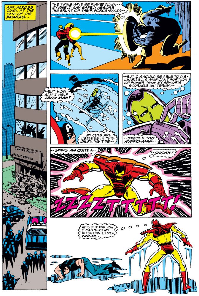 Later he’s concerned about Iron Man, who has been absorbed by Hydro-Man, who seems to have a fairly obvious weakness that Tony brilliantly exploits.