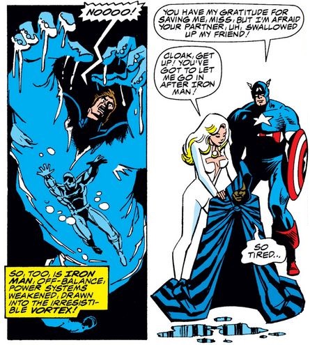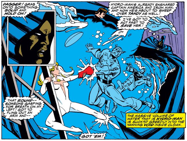 Iron Man dives into Hydro-Man (eww) to rescue Cap but is caught again, with batteries too weak to use the same trick twice. Cloak uses his transportation powers to absorb Hydro-Man while Dagger holds on to Cap…