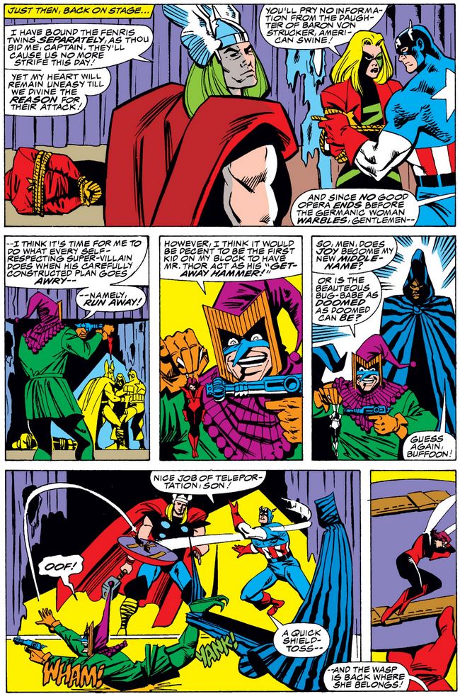 Before long, the heroes seem to have the situation in hand, with Andrea von Strucker refusing to answer a question Cap didn’t ask, and the Jester (guess which one he is) making one last attempt at a getaway…