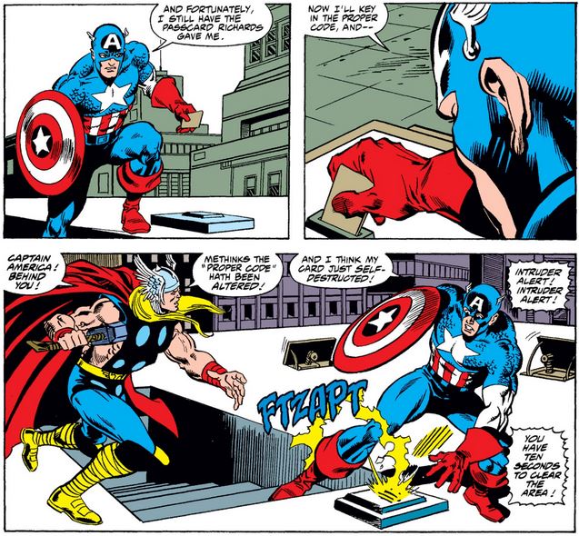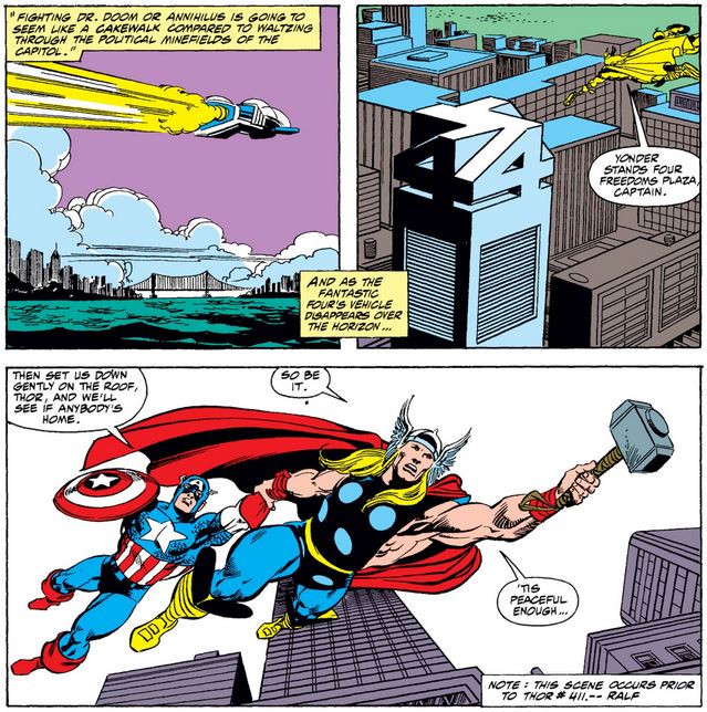 In Fantastic Four #334, which takes place in the middle of Captain America #365, Cap and Thor try to pay a visit to First Family of Marvel Comics…
