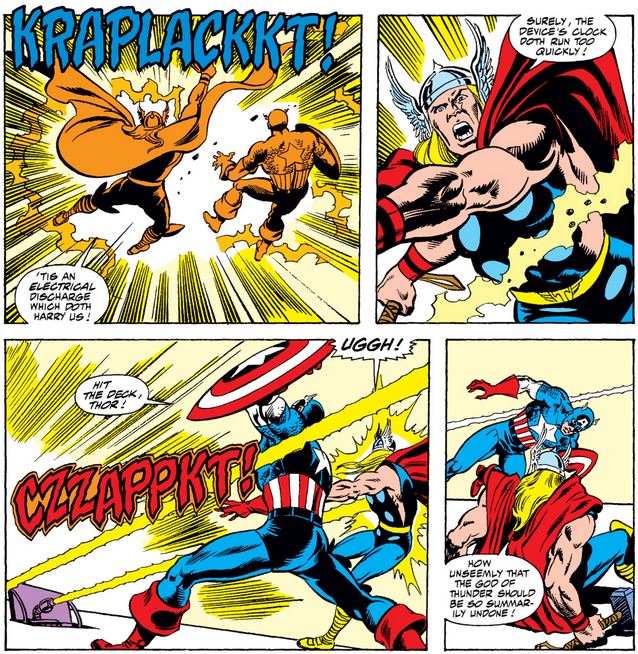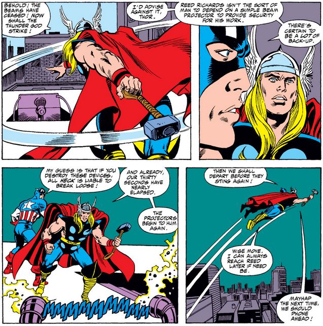 Finally, one row of panels from Quasar #5, with Cap showing confidence in the newest Avenger (whom he trained in Avengers Annual #18), which is remarkable given the power and skill of his assigned foe (who usually gives Thor a run for his money).