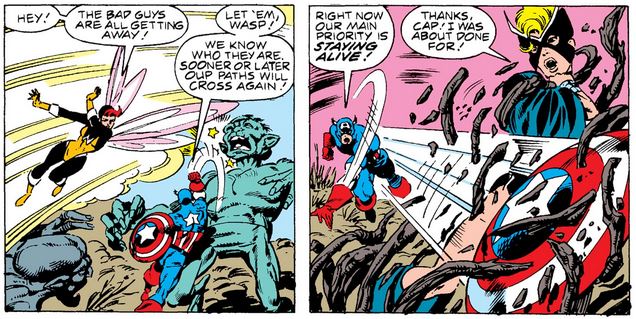 Cap is saved by Black Widow and Hellcat, and soon returns the favor as he rejoins the fight.
