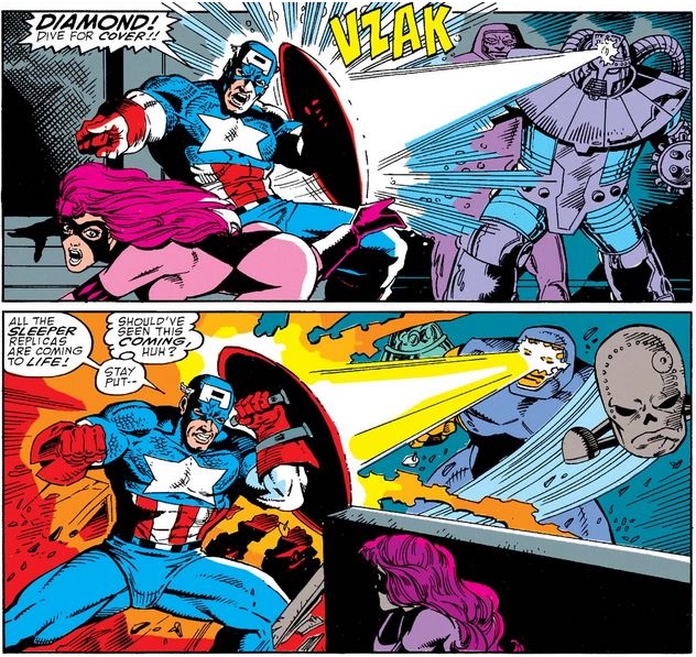 Soon they come under attack by the Red Skull’s new Sleepers, from which Cap protects Rachel and curses himself for not anticipating them…