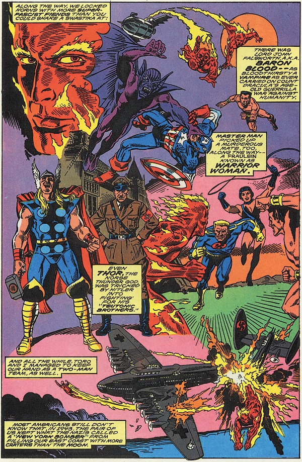 In the second issue of The Saga of the Original Human Torch, a miniseries written by Golden Age expert and Invaders scribe Roy Thomas that summarizes Jim Hammond’s World War II adventures—now that he has returned in the present day, as we saw in Avengers Annual #18 and West Coast Avengers #56—we see the formation of the Invaders…