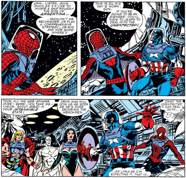 As the Avengers stare up at the Stranger’s gigantic ship, Spidey has second thoughts, but Cap is resolute as always, and lets the wallcrawler know this is all part of the gig before he gives orders to his team.