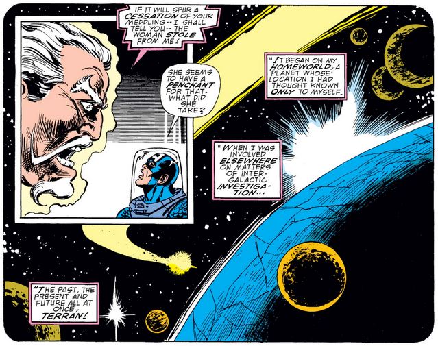 Norrin tells Cap how he, in the above-referenced Silver Surfer #38—in which Nebula also reappears after her disappearance in Avengers #318 above—destroyed Thanos’ ship and, unbeknownst to him at the time, the Mad Titan as well.