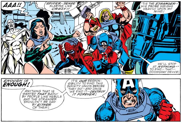 Luckily for them, Nebula’s ally Gunthar turned against her earlier and led the Stranger to the Infinity Union, and while he addresses the device itself, he gives the Avengers a more direct task, at which Cap bridles at the first, but presumably admits the risk is worth saving the entire universe. (And what makes him so sure this would be fatal to her anyway?)