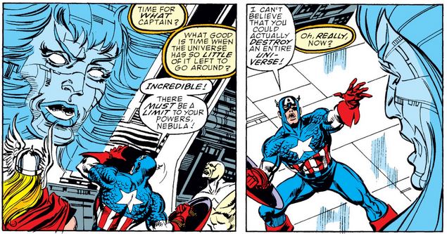 Nebula toys with the Stranger, repeatedly blinking him in and out of existence, until he looks like he had one too many rides on the Beast (the greatest roller coaster anywhere) after eating one too many chili dogs. This prompts Cap to lecture Nebula on the immorality of such torturous treatment—recalling Iron Man and Vision’s concern for alien life in issue #316—but she seems not to care. (Sigh.)
