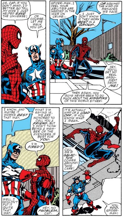 It’s interesting that Thor is the one to settle the Avenging Spider-Man down, while Cap seems more sympathetic, seeing the bigger picture as well as being more aware of human frailty and temptation. (Remember the clenched teeth and fist.)