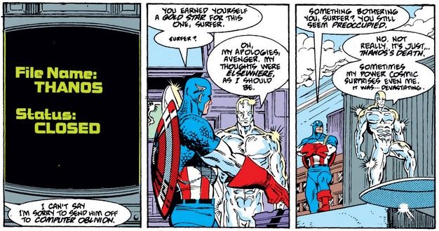 Cap is right to be skeptical: In that same issue, Thanos reveals at the end that he is very much alive, having planted a dead lookalike in his ship to fool the Surfer.