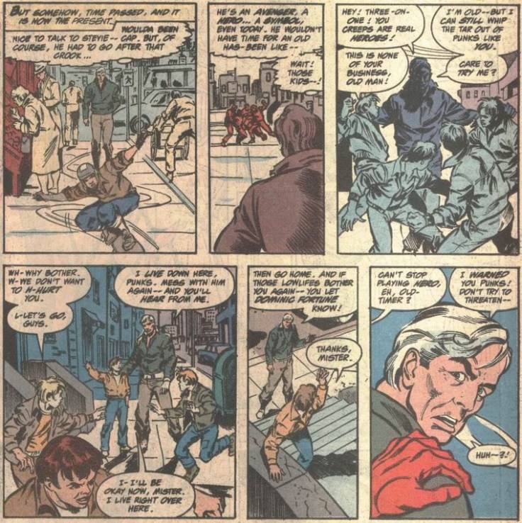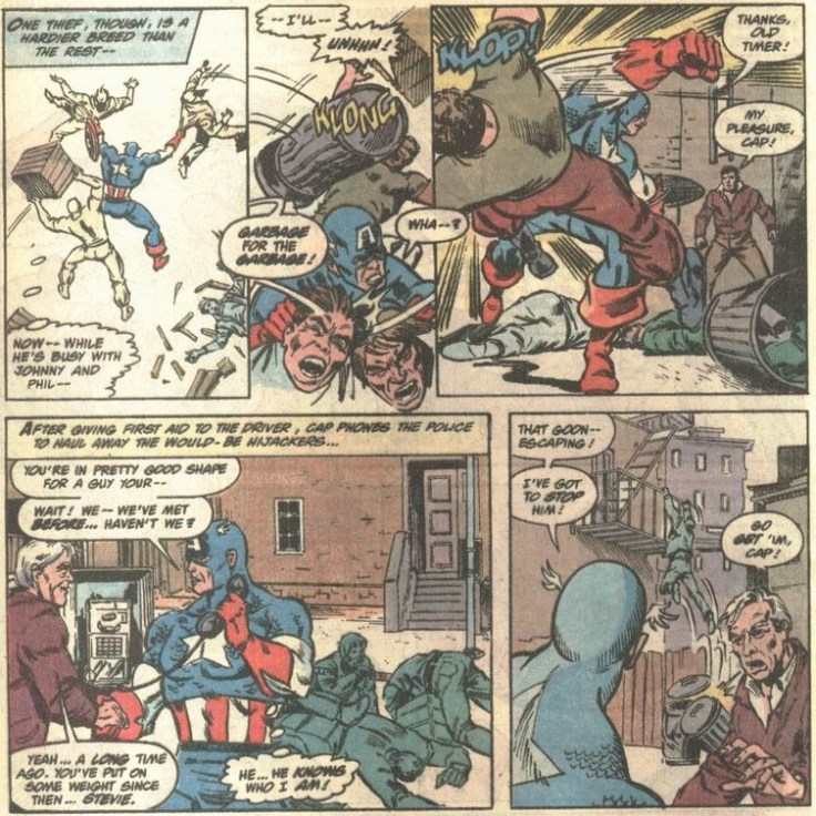 The story begins with Cap coming across a burglary in his old neighborhood, which poses little challenge, but gives writer Danny Fingeroth a chance to gush a little about the Sentinel of Liberty. (Who can blame him!)