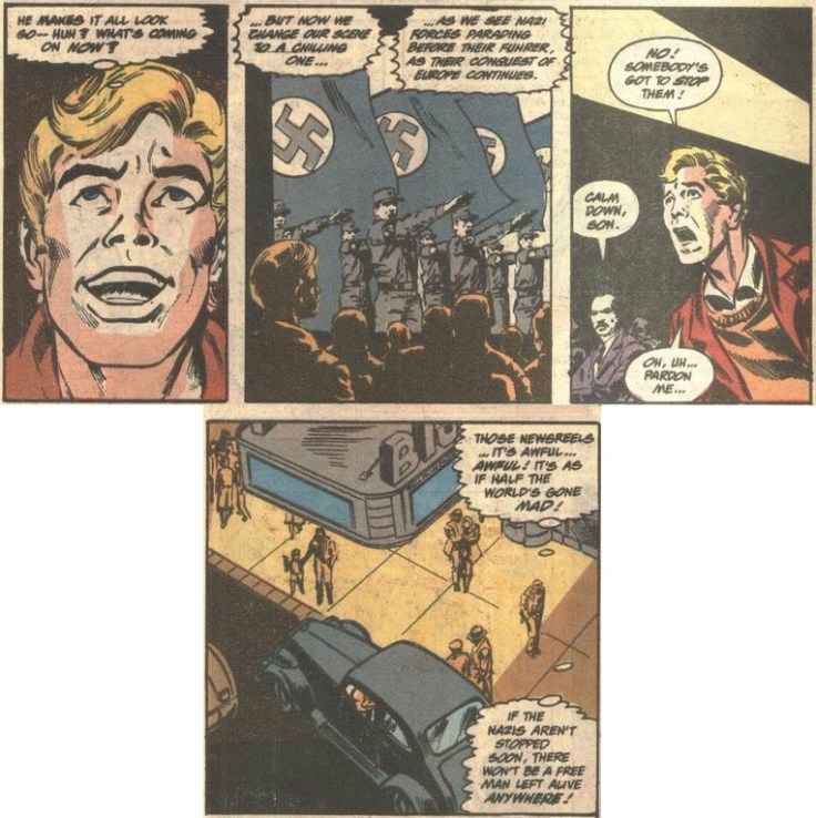 That sorted, Steve goes on to undergo the treatment, receiving the super-soldier serum and Vita-Rays, only to have a Nazi saboteur return and kill Professor Erskine, as we know. Some months later, Dominic and Sabbath are watching a newsreel and see Captain America in one of his early outings, and Dom knows right away who’s wielding the shield (while remembering that it might have been him).