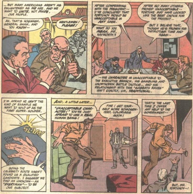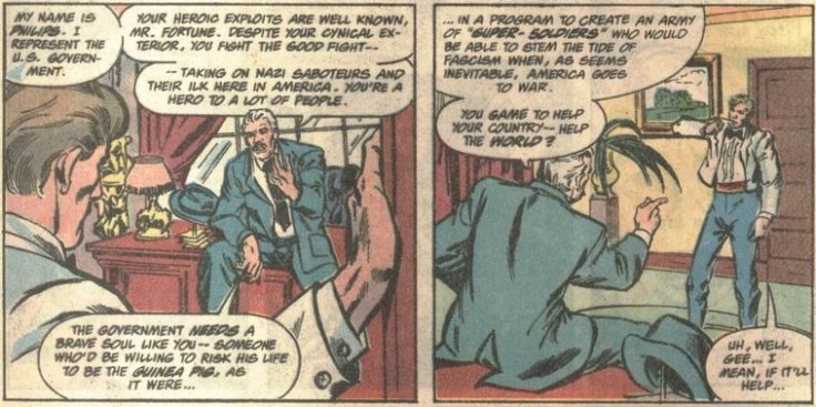 Young Steve will visit the Army recruitment center soon, but first, a new wrinkle in the familiar tale: Dominic Fortune meeting with General Philips to discuss a new secret government project.