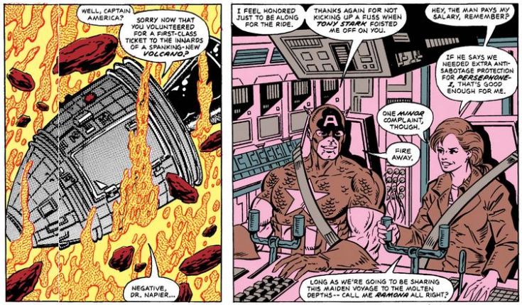 As the Captain America annual opens, we see our hero inside a craft exploring a volcano in Washington state on behalf of Tony Stark, and getting comfortable with its pilot, Dr. Ramona Napier…