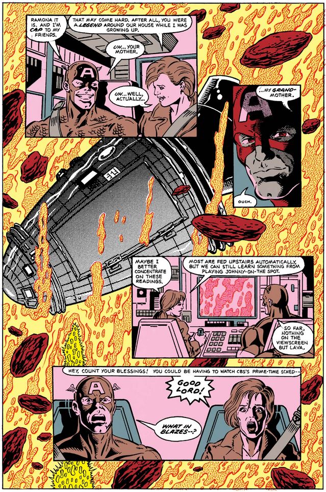…at least until she reminds him how old he actually is. (But just look at that smile!) After making a dig at CBS—known at the time for programming geared towards old folks like Cap—Ramona and her copilot see the glowing yellow field at the bottom of this page…