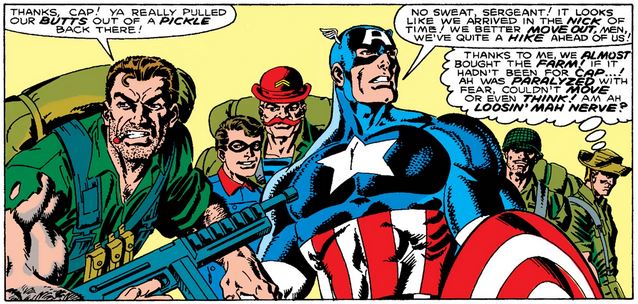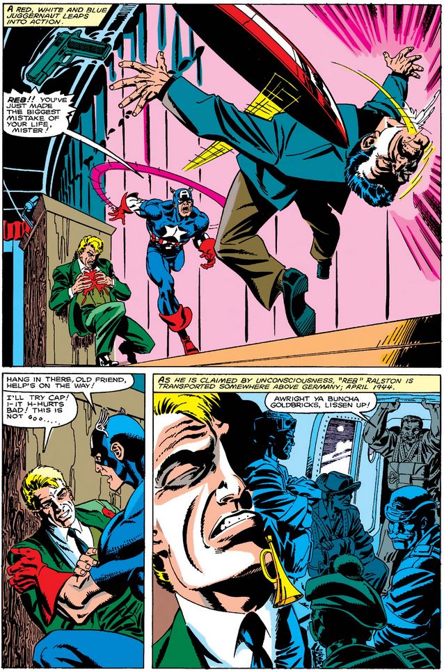 Cap, Bucky, and the Commandos prepare to escape on the Skull’s plane, and Cap has to convince Reb to come with instead of providing cover.