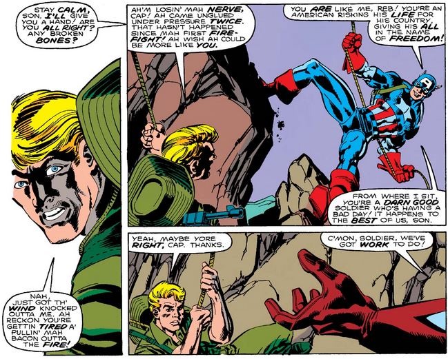 Soon, Cap, Bucky, and the Commandos are scaling the mountain to the castle where the Skull is holding the Starks. Reb falls and is saved by his line, but he’s still terrified, and Cap finds him freaking out. After saving him, Cap tries to lift his spirits, telling him they’re not so different after all. (“In fact, you look just like me!”)