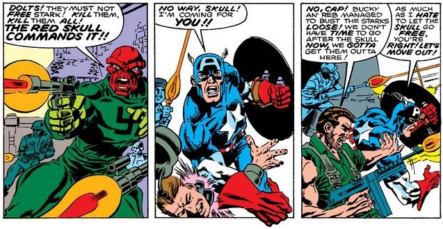 Bucky and Reb surprise the Skull, chasing him away before defeating his henchmen and freeing the Starks. Cap and the Commandos are waiting outside for the Skull, whom Cap wants to capture, but this time Nick has to remind him that getting the Starks to safety is the priority (which Cap accepts, with regret).