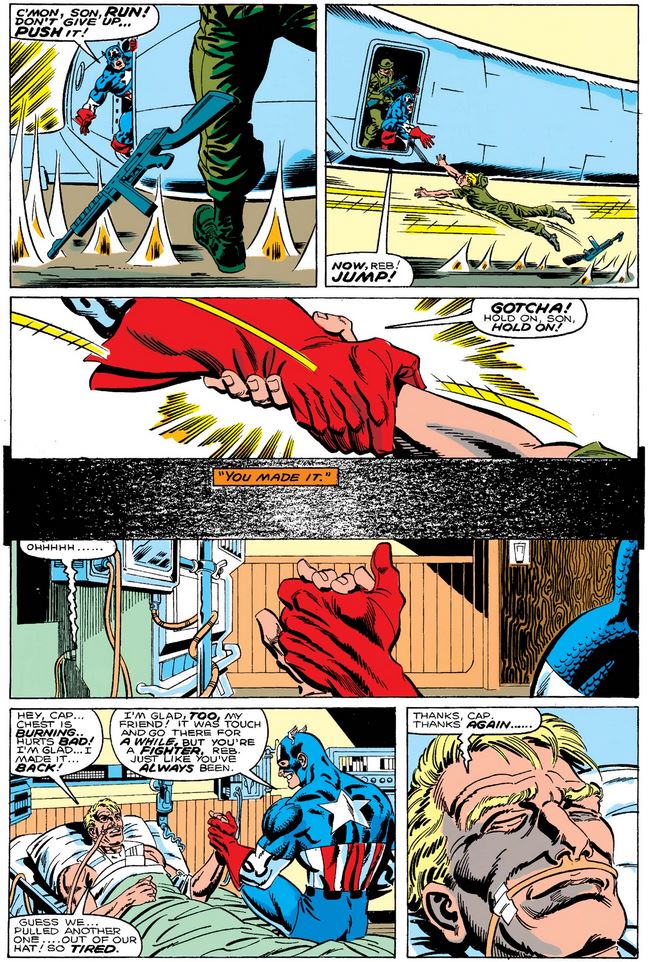 Reb leaps and catches Cap’s hand just in time… and in 1990, he wakes to find the same hand in his, supporting a fellow hero in any circumstances and any decade.