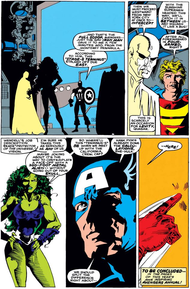 Throughout the Iron Man, Thor, and West Coast Avengers annuals, the Terminus threat grows even larger, eventually taking its normal monstrous form (after destroying and absorbing its “son”—don’t ask) and becoming “Terminus-5.” Eventually, the main team is drawn into the fight on the last page of the West Coast Avengers annual…