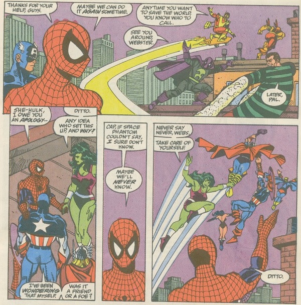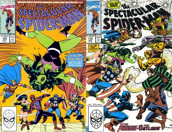 In issue #168, She-Hulk leads Spider-Man to a condemned building where they open a crypt and release a strange black substance—not a symbiote—after which Spidey becomes trapped in the crypt and She-Hulk abandons him to die. After he frees himself, Spider-Man calls on She-Hulk at the Avengers’ headquarters, literally alarming the entire team in the process.