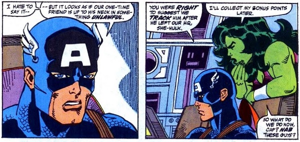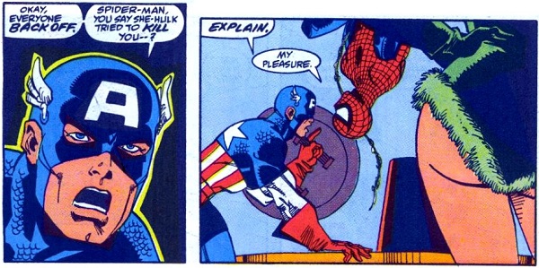 When all is said and done, Spidey takes She-Hulk’s hand and apologizes to her, while his other hand rests on Cap’s shoulder, for some reason. (Perhaps to steady himself in case She-Hulk does not accept his apology?)