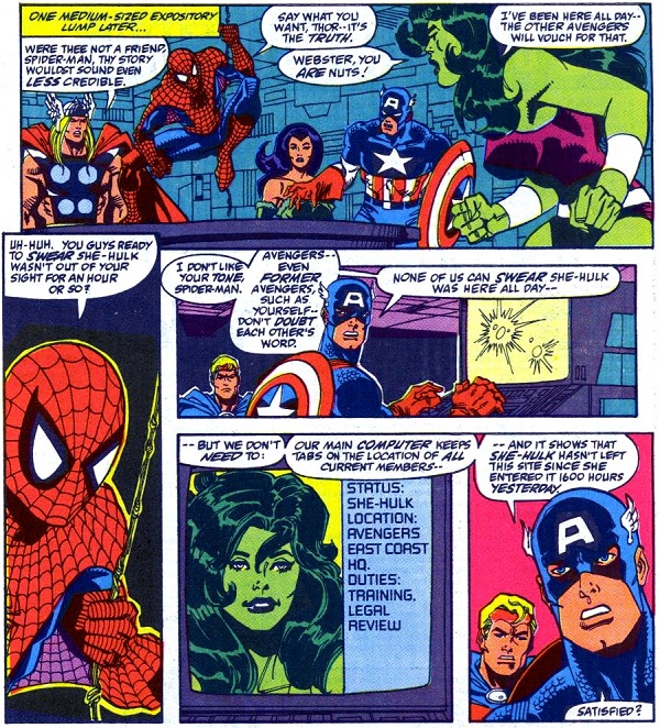 She-Hulk assures Spidey she was at Avengers headquarters all day, and when he doubts her, Cap really takes offense—and provides hard evidence to back her up.