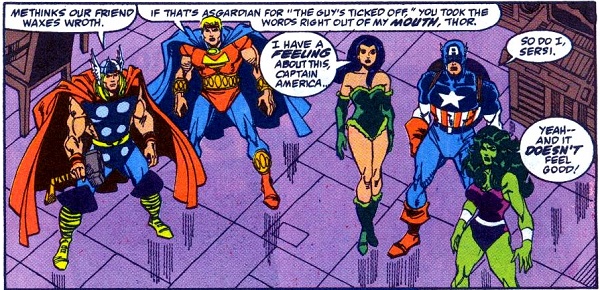 The Avengers cast their votes on their next step, with Thor and She-Hulk, against type, recommending patience, and Sersi and Quasar giving Cap their proxies… which he uses to side with the first two. (Democracy in action!)