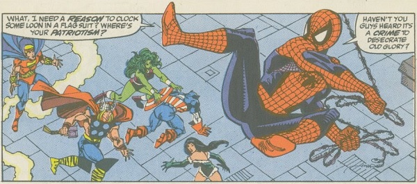 Then, to make matters worse, Spidey dredges up the old canard about Cap’s costume, given to him by the United States government, abusing the American flag.