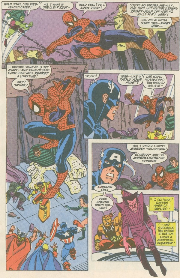 While the two teams fight, Spider-Man disappears and reverts to the Space Phantom, the foe from Avengers #2 (pre-Cap!) that later became a deus ex machina for resolving continuity problems. When the real wallcrawler returns, he tries to stop the fight the Phantom started, claiming he wasn’t himself… and luckily, the real culprit, who also impersonated She-Hulk at the beginning of issue #168, didn’t get away (thanks to Puma’s enhanced senses).