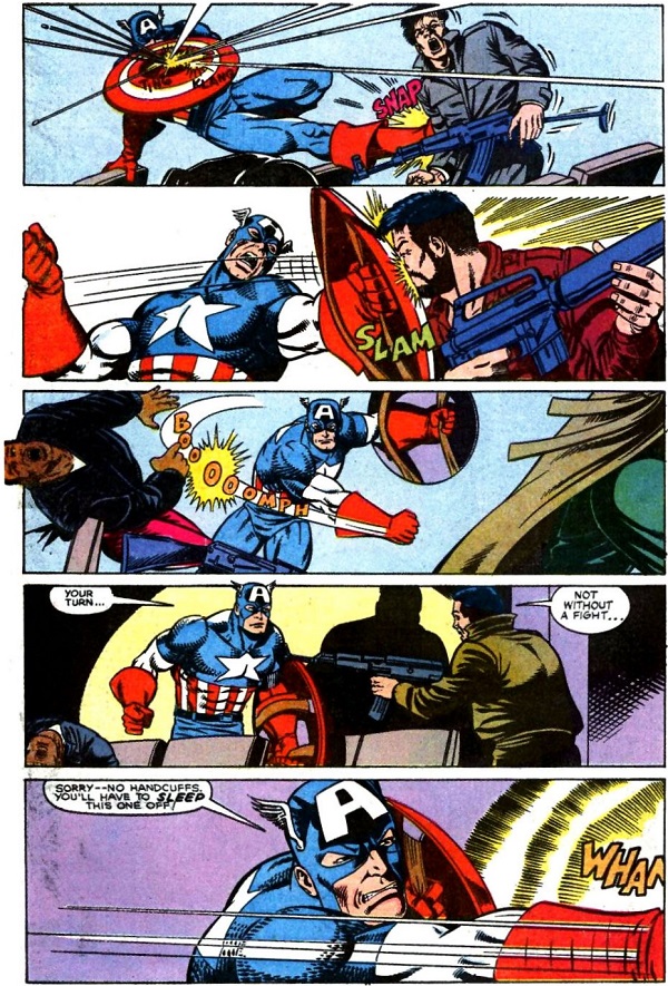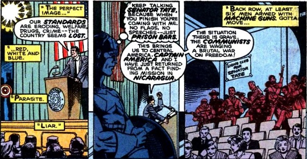 Note how Cap does not commit to a firm position on international communism or the U.S. position in Nicaragua, standing up instead for peace above all while criticizing the senator’s self-serving motives. (Also, in our world, the Sandinistas were voted out of power in early 1990; either events in the Marvel Universe turned out differently, or this story was finished and archived much earlier.)