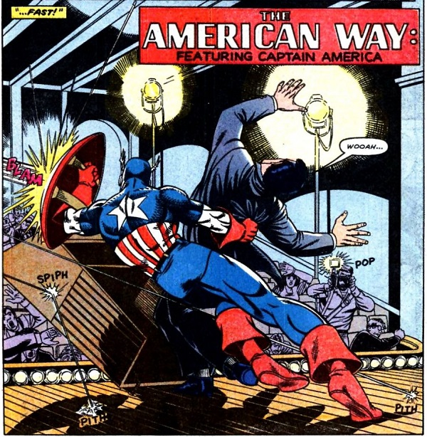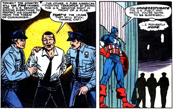 This is not the first time Cap has been disappointed in the power and behavior of the media, which was a plot point as early as the Secret Empire episode in the mid-70s. (Also, this story serves as an interesting contrast to one in the previous month’s Captain America Annual #9, featuring a U.S. senator much more to Cap’s liking, who almost falls to an assassination attempt by a man hysterically accusing him of being a communist.)
