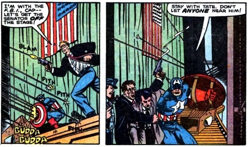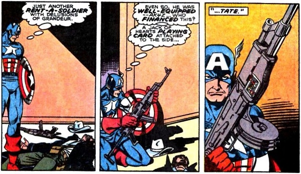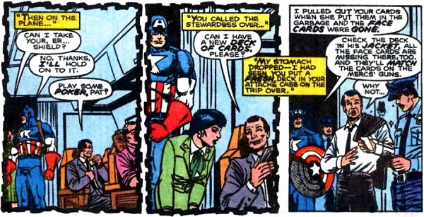 Afterwards, Tate and a police officer praise our hero’s good work, but Cap is more interested in laying out his case against the senator, beginning with where he’d seen a similar playing card before, in Nicaragua…
