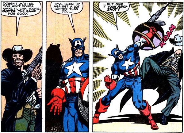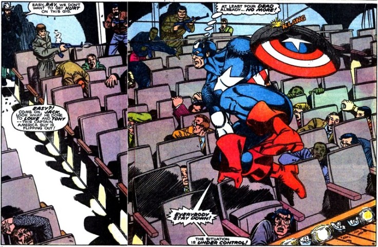 At least the civilians keep their heads down while Cap addresses the gunmen…