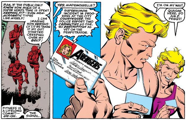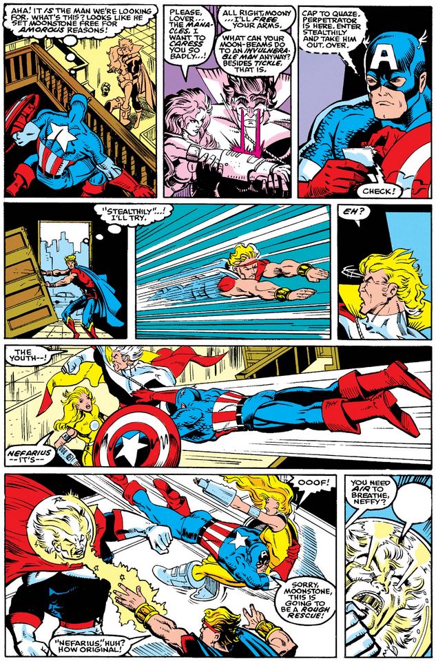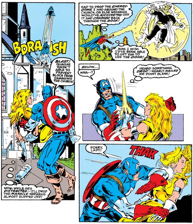 Nefarius eventually gets the upper hand on Quasar, so Cap self-consciously flings his shield at his head… and Lloyd “catches” it in a way I don’t care to see again.