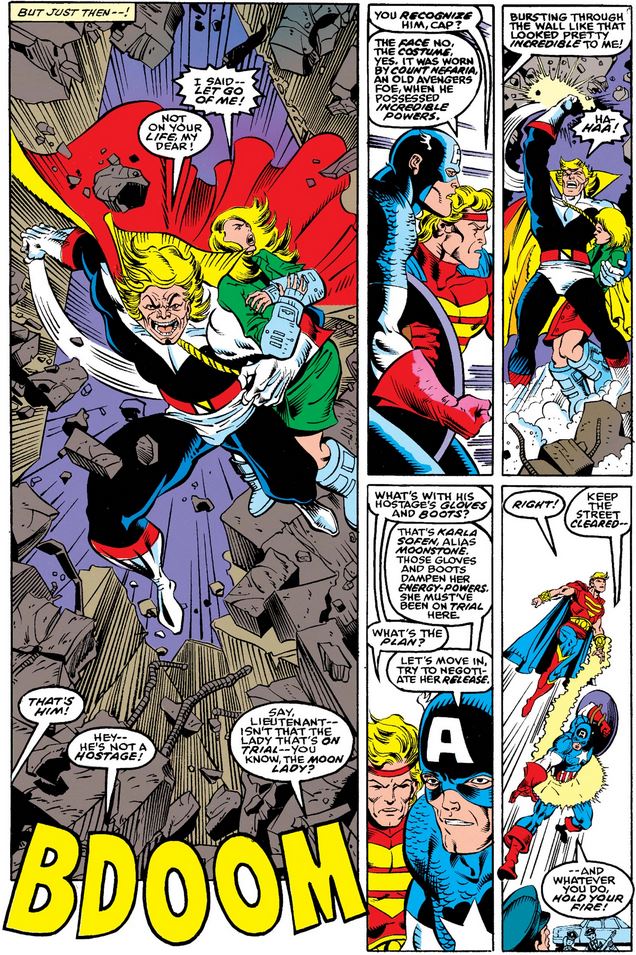 When the guests of honor burst out of the courthouse, Cap and Quasar recognize them… somewhat… with the older hero taking command of the situation.