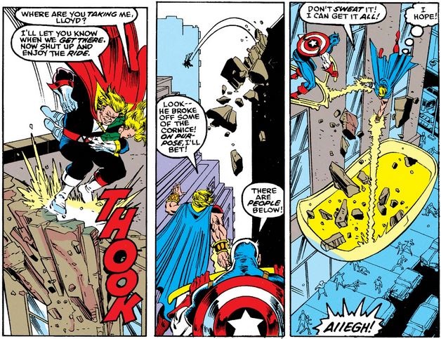 Oh, it’s Lloyd, of course… Lloyd! (We do know him, as we’ll soon learn, but there’s no shame in not remembering him—I sure didn’t!) But naturally, Cap is more concerned with civilians endangering by the falling debris.