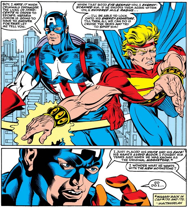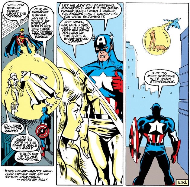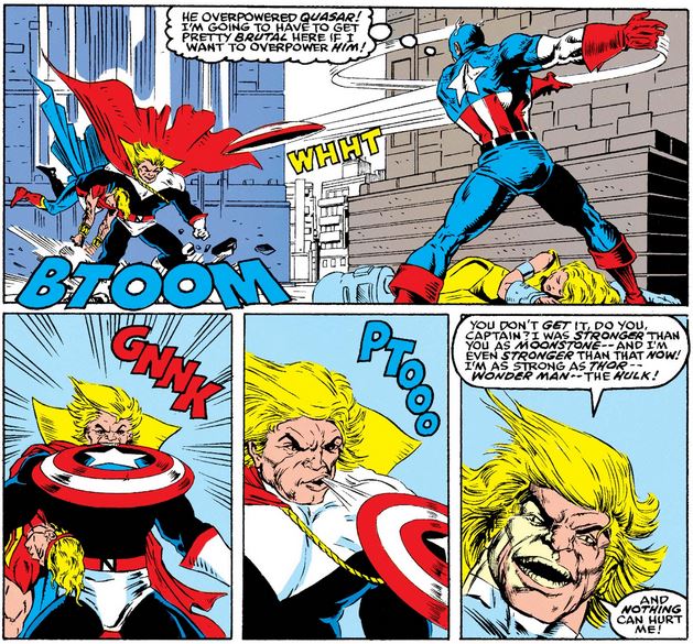 Cap finds the two Moonstone embracing—although for Karla it’s just an act, and not a good one at that—before he summons Quasar, who can’t help making a jab at Lloyd’s name either.